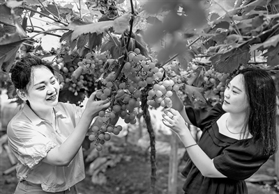 8月3日,游客在万年县苏桥乡道山村葡萄基地采摘葡萄。近年来,当地通过组建专业合作社和产业协会等形式,鼓励引导农民发展葡萄产业,带动1000多农户致富。