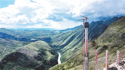 正在修建中的花江峡谷大桥5号主塔(8月2日摄,无人机照片)。