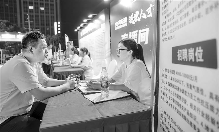 8月3日晚,2023年“洪漂人才荟”品鲜聚才集市招聘会在江西青云谱新经济产业集聚区举行,“招聘夜市”共有20多家企业提供岗位300余个,吸引众多求职者参与。图为求职者在咨询相关信息。