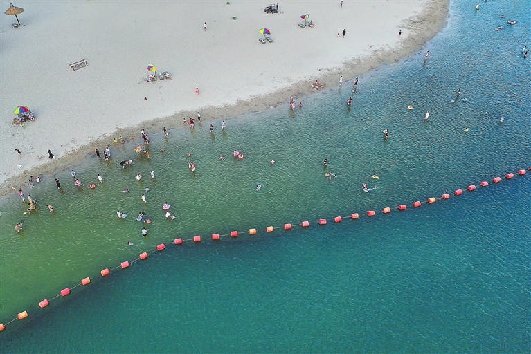 ▲ 近日,抚州市东乡区佛岭国际公园,市民或漫步沙滩,或在水中畅游,乐享清凉。持续高温天气,可以沙滩吹风、浅水畅游的佛岭国际公园,成为当地的网红打卡地。本报全媒体记者 徐 铮摄