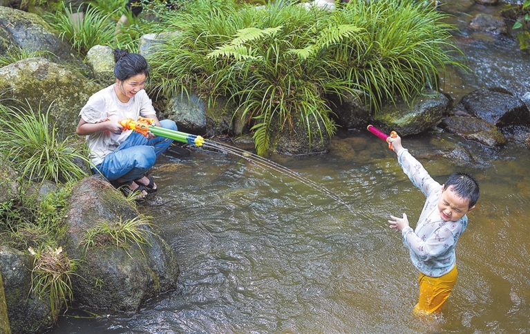 ◀ 8月5日,南昌市湾里管理局太平镇神龙潭景区绿树成荫、凉意十足。不少市民带着孩子在山涧露营戏水,在青山绿水间放松心情,感受夏日清凉。本报全媒体记者 史港泽摄
