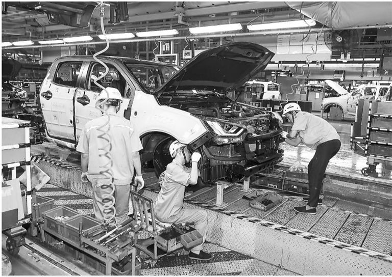 8月9日,在江西五十铃汽车有限公司整车生产车间,工人正铆足干劲装配车辆。近年来,该公司通过提升生产设备,每天可生产200台汽车,今年预计销售车辆5.1万台。本报全媒体记者 洪子波摄
