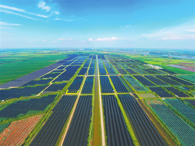 7月24日,位于南昌县蒋巷镇三洞湖渔光互补光伏发电项目现场,一排排光伏面板正源源不断输出清洁电能。该项目总占地面积6100亩,每年可发电约2.6亿千瓦时,将水产养殖与光伏发电相结合,形成“板上发电、板下养殖”新模式,提高了土地使用效率。本报全媒体记者 田 野摄