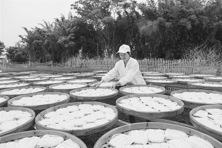近日,在信丰县古陂镇,村民正在晾晒手工面。据了解,古陂手工面是当地一项特色产业,也是当地一道特色美食,长期以来一直畅销市场。本报全媒体记者 曹章保摄