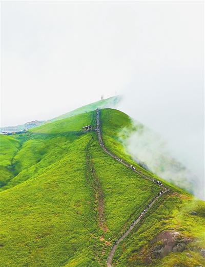 8月3日,武功山金顶云卷云舒“犹抱琵琶半遮面”。手掬一捧白云,眼览一缕青绿,游客犹如置身仙境。暑期旅游高峰,萍乡武功山风景名胜区游客络绎不绝。