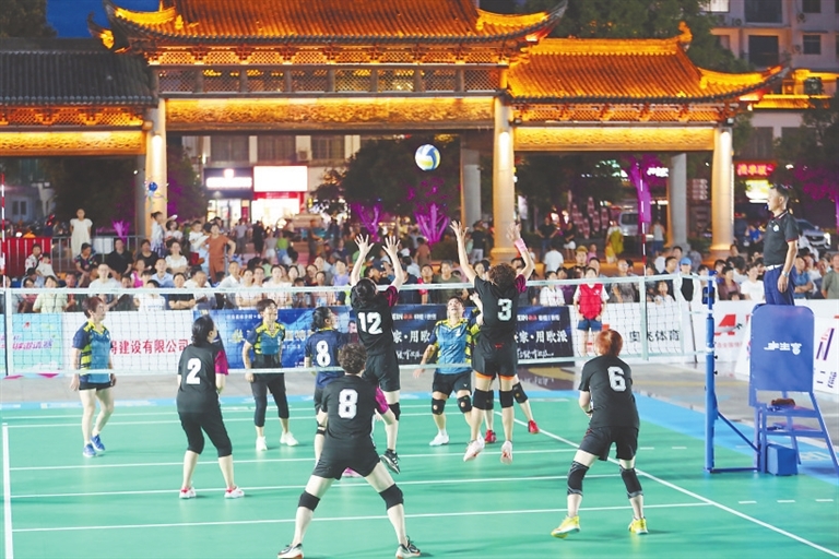 7月21日至31日,齐聚317支代表队的第八届“中国最美乡村”全国气排球邀请赛在婺源进行。与以往不同,此届大赛中的一些精彩赛段,与婺源徽剧、婺源傩舞等国家级非遗一起,走出了体育场馆与戏院剧场,被安排于晚间时刻,在婺源紫阳公园等公共区域进行比赛、展演。在保障公共安全的前提下,本次邀请赛从预赛到决赛,各阶段赛事及文化艺术展演活动合流回归生活,游客与市民无须购票即可零距离观赏。夏夜凉风拂面,大赛里平添的这些“烟火气”,感染着熙来攘往的游客们,大家或穿梭在不远处的夜市排档间,或驻足观看比赛、演出,或随着音乐节奏舞动起来。