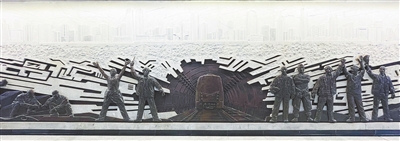 雕塑《托举起城市的力量》(上图),集中展现地铁建设的艰辛过程以及建设者们用心血和汗水托举起城市的强劲力量。作品用深灰砂岩作底衬,地平线下用石板覆盖,展现地铁盾构的造型,坚固且极富张力,板块之间缝隙与金属线构成强烈的透视感,使人感受到地铁建设的复杂性和艰巨性。这件雕塑作品,艺术展示了南昌的历史传承和城市发展的壮丽画卷,也温情刻画了南昌优雅内敛、浑厚稳重的城市形象,为乘客们带来了一段宛如时间穿越之旅。
