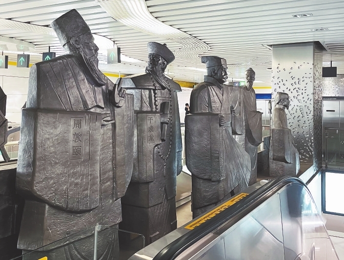 在地铁2号线的国体中心站,用公共艺术的形式打造了一张“廉洁名片”。地面出入口以荷叶为设计题材,提炼叶脉元素,将“廉”文化与艺术形态相结合;主墙面大型汉白玉浮雕,内容以《爱莲说》为主题;站厅层以“一体四翼”(四个出入口通道的两侧墙面)的空间布局表达“廉”文化的精神内涵;自动扶梯旁设置了历代十大廉吏雕像(下图),用以丰富空间层次。