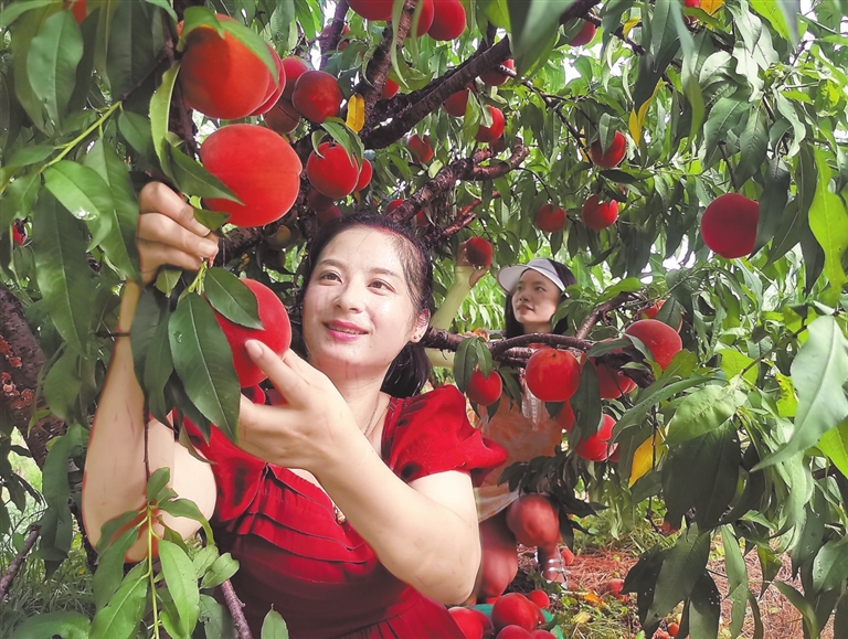 ◀近日,靖安县官庄镇哨前村130余亩水蜜桃迎来丰收季,前往采摘的游客络绎不绝。据悉,该村水蜜桃年产量9.5万公斤左右,产值可达70万元。通讯员 胡淑婷摄