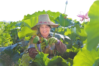 ▶近日,在莲花县良坊镇湾溪村,村民正在采收莲蓬。近年来,当地大力发展农业休闲产业,种植荷花、油菜等生态作物,吸引游客前来赏花休闲、采摘游玩,带动农民增收。 特约通讯员 贺治斌摄