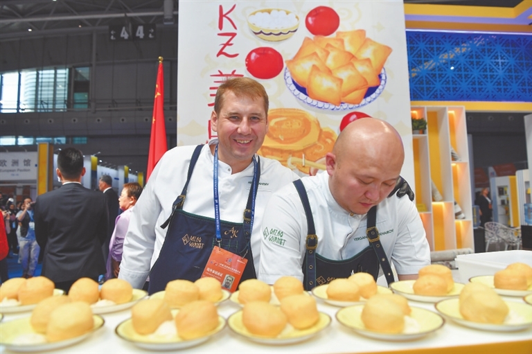 8月17日,来自哈萨克斯坦的厨师在2023(中国)亚欧商品贸易博览会上制作美食。当日,2023(中国)亚欧商品贸易博览会在新疆乌鲁木齐市开幕。本届商博会为期5天,共有1300余家中外企业参展。新华社记者 赵 戈摄