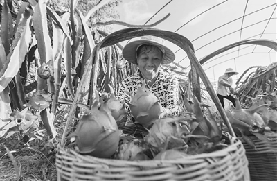 8月16日,在永新县高市乡洲塘村火龙果种植基地,果农正忙着采摘、分拣火龙果,确保市场供应。