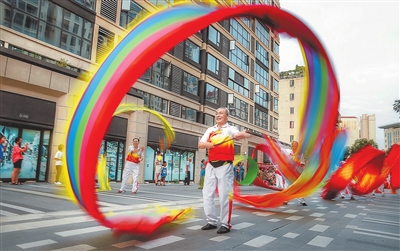 8月18日,南昌市湾里管理局幸福街道阳光社区,居民在邻里中心广场上进行舞龙表演。当天,阳光社区举行勤廉文化主题趣味运动会,舞彩龙传非遗、吹乒乓过水杯、呼啦圈竞速跑等多个竞技表演项目,丰富了社区居民的文化生活。本报全媒体记者 徐 铮摄