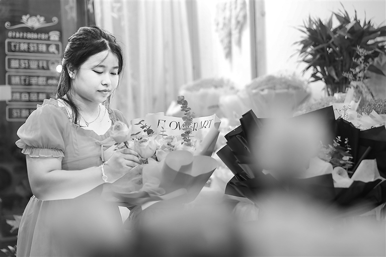 8月21日,南昌高新区一家花店,商家正在按照订单包装花束。七夕节到来带火了花店生意。 本报全媒体记者 张翰林摄