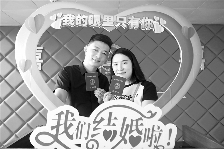 8月22日是传统七夕节,在峡江县民政局婚姻登记处,一对新人正在合影留念。 通讯员 曾 玲摄