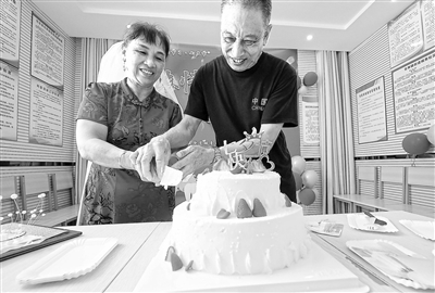 8月17日,吉安市吉州区,一对金婚老人在“金婚迎七夕 爱在社区”活动中一起切蛋糕。特约通讯员 李 军摄