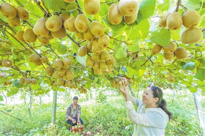 8月17日,新余市渝水区下村镇下住村猕猴桃种植基地,果农在采摘猕猴桃。近年来,渝水区因地制宜发展猕猴桃、葡萄、蜜橘、马家柚、火龙果等特色产业,助力农业增效和农民增收。 通讯员 廖海金摄