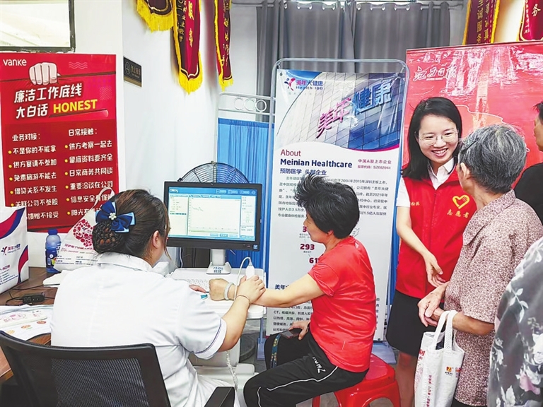 “大爷,您有点骨质疏松,平时要注意补钙。”“阿姨,您发质不错,但有点发黄,要多补气血。”“您血压有点偏高,降压药要记得每天按时吃。”……美年大健康的医务人员为前来体检的居民耐心地做检查、讲解情况、提出建议,并开展健康科普教育。有些患者情况复杂,医务人员及时提醒他们做进一步检查,预控疾病风险。