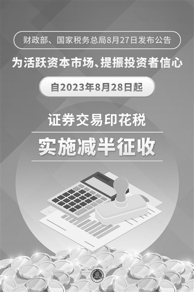 新华社北京8月27日电 记者27日从财政部了解到,财政部、国家税务总局当日发布公告称,为活跃资本市场、提振投资者信心,自2023年8月28日起,证券交易印花税实施减半征收。