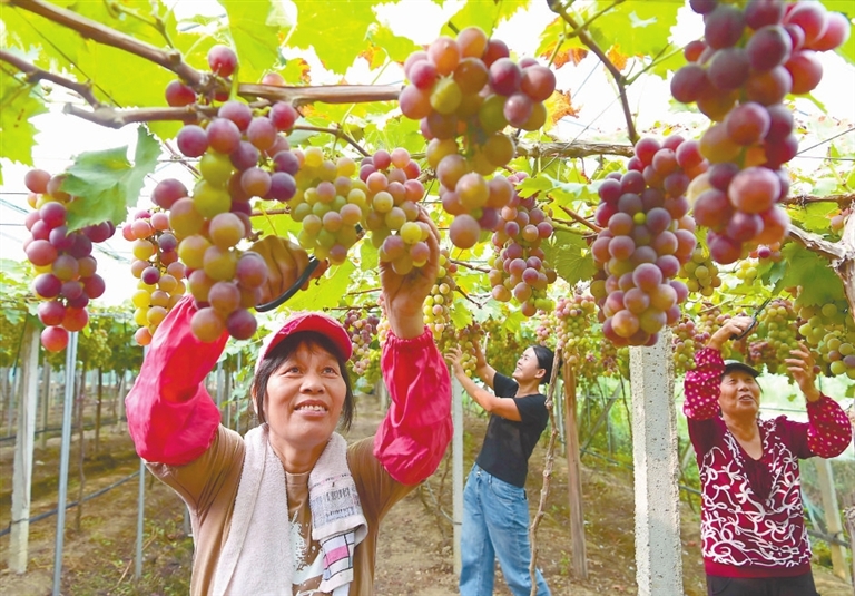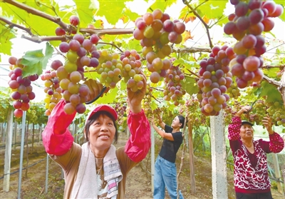近日,万载县三兴镇湖源村,果农正在采收葡萄。近年来,该村将100亩闲置土地流转种植葡萄等特色水果,拓宽农民致富渠道。