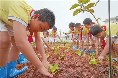 ◀8月31日,赣州市章贡区章江路小学东校区的开学第一课生动有趣,老师带领学生们开展田间课堂活动,让学生们亲手移植大白菜苗,在劳动实践中提升劳动技能,培养劳动兴趣。