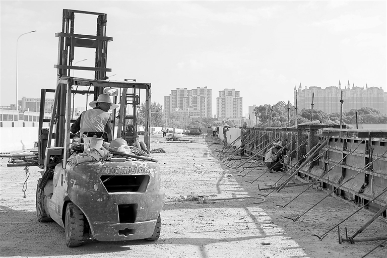 9月4日,在南昌市S49枫生快速路北段提升改造工程施工现场,工人们正在进行防撞墙施工。目前,该工程桥梁主体结构已全部完工,各施工节点正稳步推进,预计本月底实现西半幅主线通车。