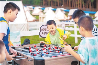 近日,孩子们在露营地玩台式足球。宜春市明月山温泉风景名胜区围绕“露营+旅游”提升游客体验感,不断完善住宿餐饮、休闲娱乐配套设施,推出更多符合游客休闲需求的优质产品和服务,激发文旅融合发展活力。谢文凡摄