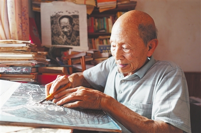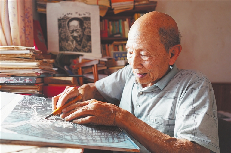 秋日,阳光透过翠绿的香樟树,洒落点点光斑。在分宜县城区的一栋居民楼里,十多平方米的旧房间,一张书桌、一把椅子,简单朴实的创作环境,只见83岁的李世慰老人,左手按着木板,右手握着刻刀,正专注地刻着版画。