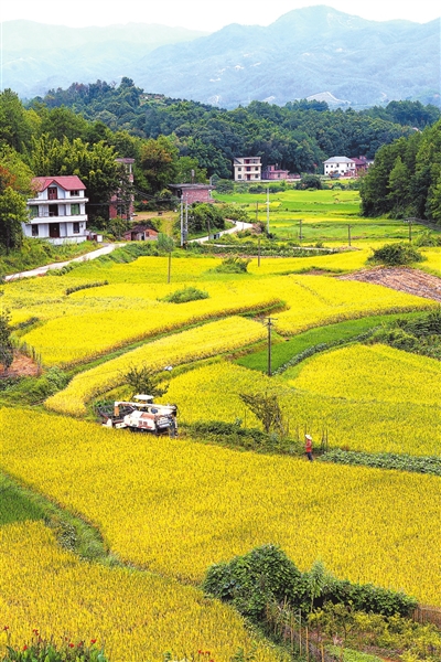 9月3日,兴国县江背镇江背村农民正组织“田保姆”收割队收割中稻,田间地头一派忙碌的丰收景象。
