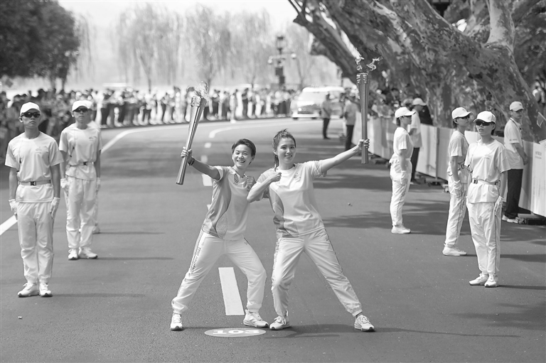 ▲火炬手王霜(左)与王沁鸥在火炬传递中。新华社记者 黄宗治摄