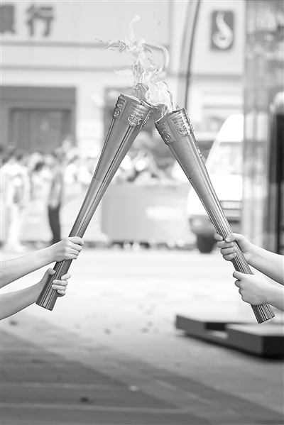 ◀火炬手在火炬传递中交接。 新华社记者 江 汉摄