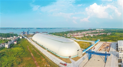 9月5日,无人机航拍位于九江市柴桑区的九江港赤湖作业区公用码头全封闭智慧“胶囊”仓库。该仓库面积约2.5万平方米,实现全密封仓储、装卸,有效控制和降低扬尘,作业更加环保,助力长江生态环境保护。