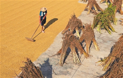 ▶9月9日,泰和县农民正在晾晒稻谷、芝麻、花生,构成一幅晒秋图。 特约通讯员 邓和平摄