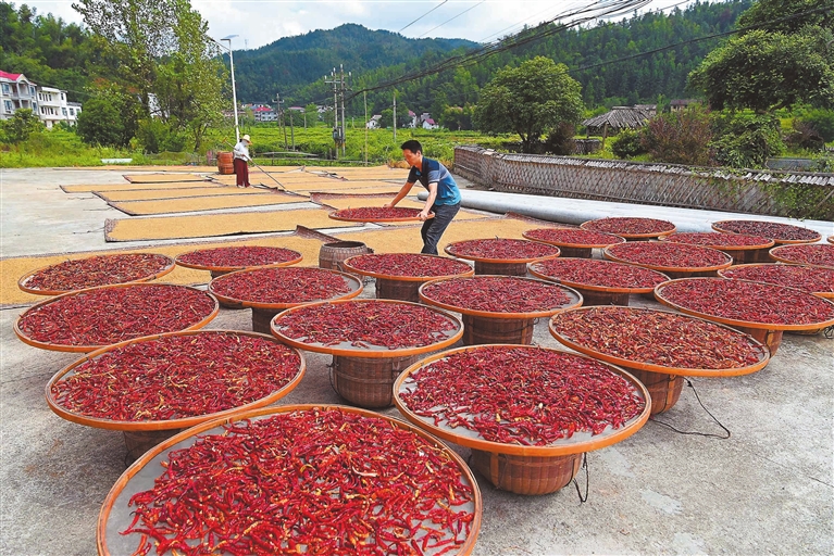 ▼9月7日,在万载县茭湖乡谢溪村,村民正在晒丰收的农作物,到处呈现出喜气洋洋的丰收景象。 特约通讯员 邓龙华摄