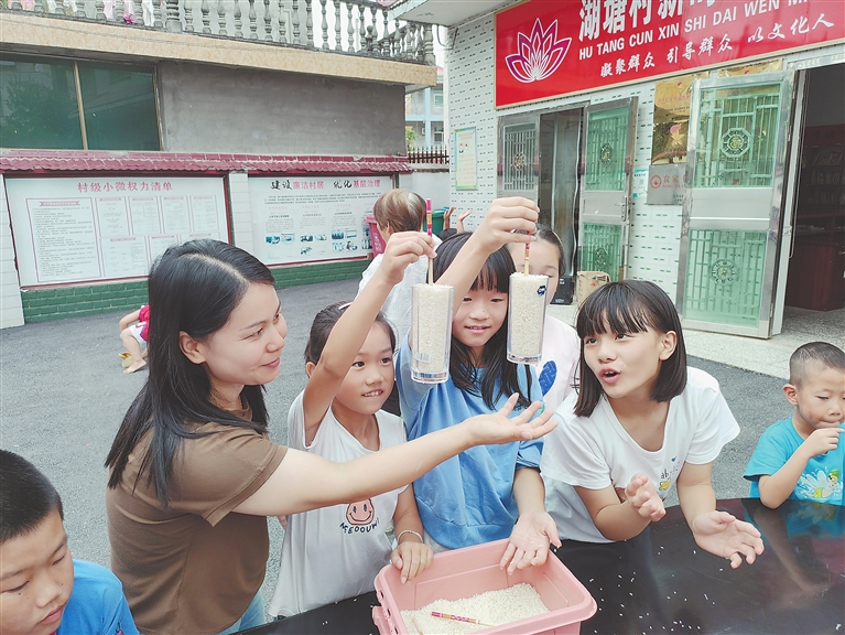 ▲日前,莲花县路口镇社工站、文化站及科技志愿服务队在该镇湖塘村新时代文明实践站开展科普宣传活动,工作人员在指导孩子们开展“筷子提杯子”科学实验。朱晨欣摄