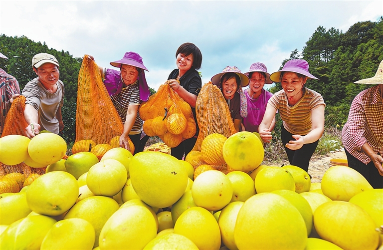 9月18日,定南县鹅公镇留坑村三红蜜柚种植基地,村民喜获柚子丰收。特约通讯员 詹继成摄