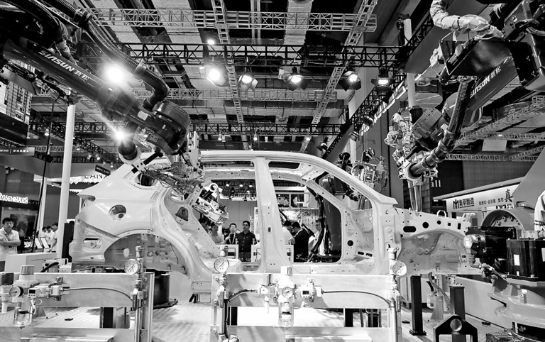 9月19日,参观者在一组进行车身焊接演示的机器人前驻足观看。