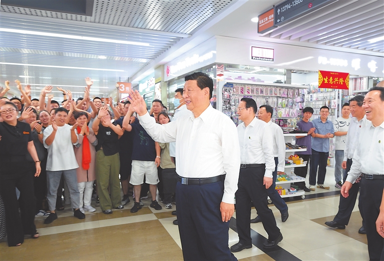 随后,习近平来到义乌国际商贸城考察。他通过电子屏幕实时了解商贸城运营及“义新欧”班列运行情况,并走进市场同商户、小企业主代表亲切交流,详细询问市场行情。他强调,义乌小商品闯出了大市场、做成了大产业,走到这一步很了不起,每个人都是参与者、建设者、贡献者。商贸城要再创新辉煌,为拓展国内国际市场、畅通国内国际双循环作出更大贡献。