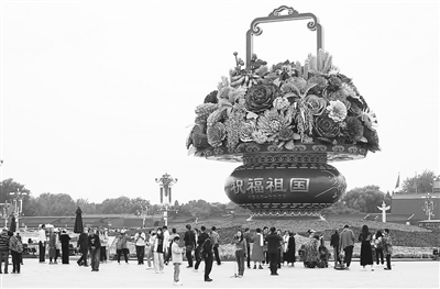 这是9月25日在北京天安门广场拍摄的“祝福祖国”巨型花篮。