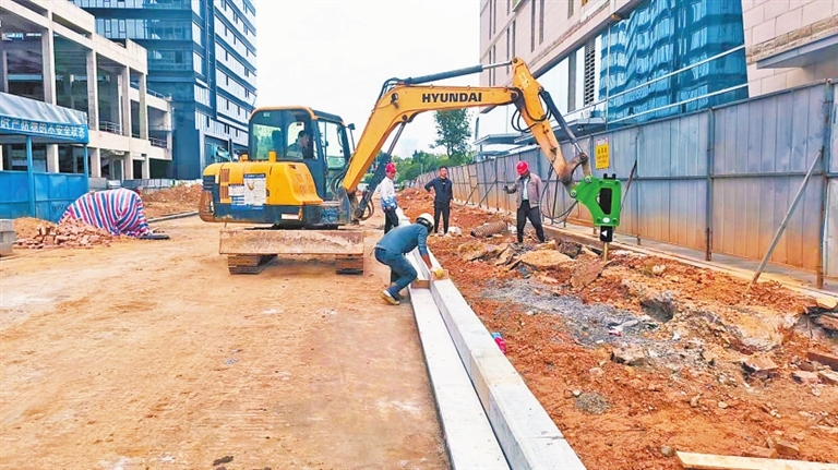 近日,芳林路(凤凰中大道-金融大街)比原计划提前1个月通车;启华路(慧谷路-腾科路)现场,机械轰鸣,正在进行碎石摊铺工作;在北外滩J路(赣江北大道-红谷中大道),工人正在进行道路平石、路沿石铺装。