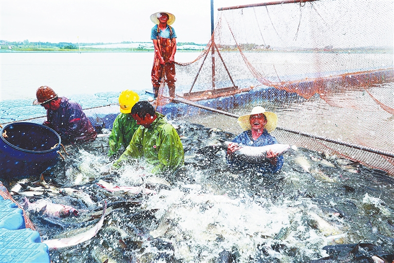 9月23日,在鄱阳县饶埠镇万亩水产基地,正在捕鱼的渔民们脸上洋溢着丰收的喜悦。该基地每年捕捞各类水产品逾0.25万吨,年产值约4500万元。本报全媒体记者 洪子波摄