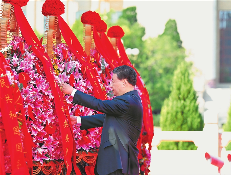 习近平迈步上前,仔细整理花篮缎带。随后,习近平等党和国家领导人缓步绕行,瞻仰人民英雄纪念碑。