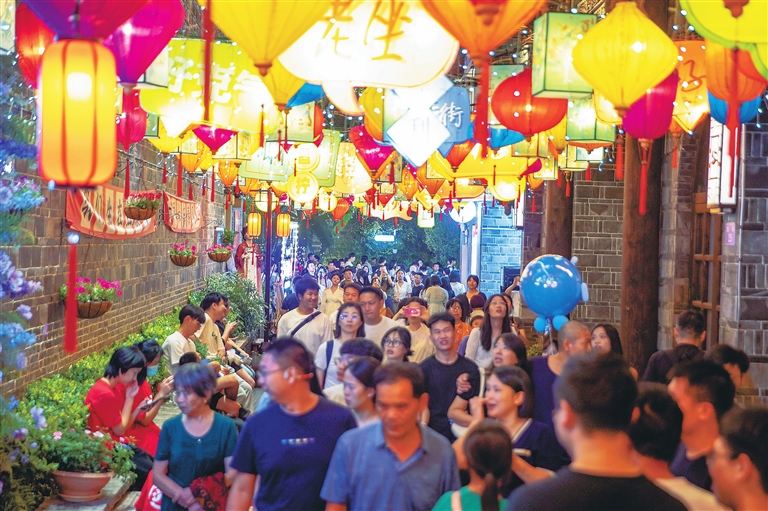 9月30日,南昌万寿宫历史文化街区灯光璀璨,人山人海。中秋国庆假期,该街区举办丰富的文旅活动,吸引众多游客前来游玩。本报全媒体记者 洪子波摄