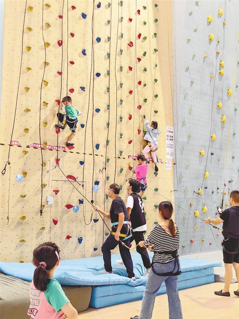 10月3日,在南昌市国体中心,小朋友在专业人员指导下开展攀岩练习。本报全媒体记者 蔡铖歌摄