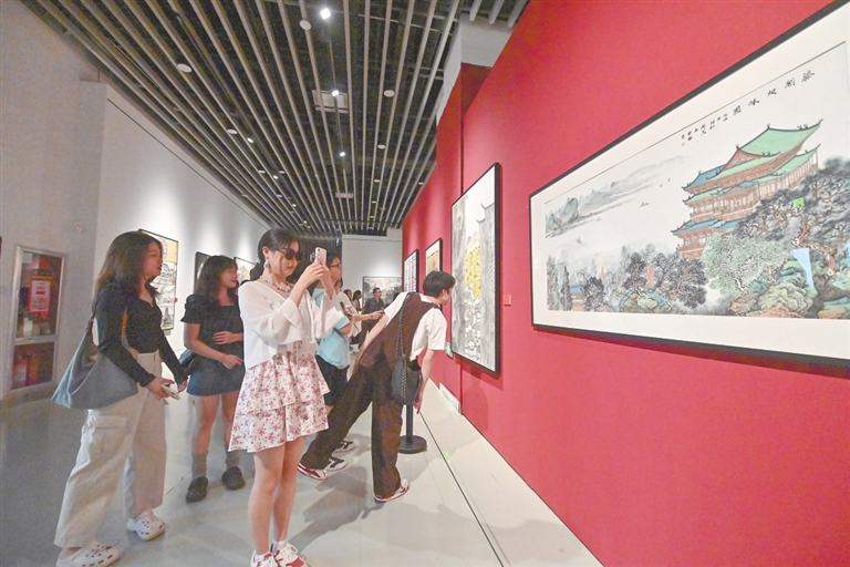 10月1日,在江西省美术馆,观众正在参观“奋进新征程 丹青绘赣鄱”江西省大型美术作品展。中秋国庆假期,江西省美术馆推出丰富的精品艺术展,吸引众多市民游客前往观展。本报全媒体记者 李 劼摄