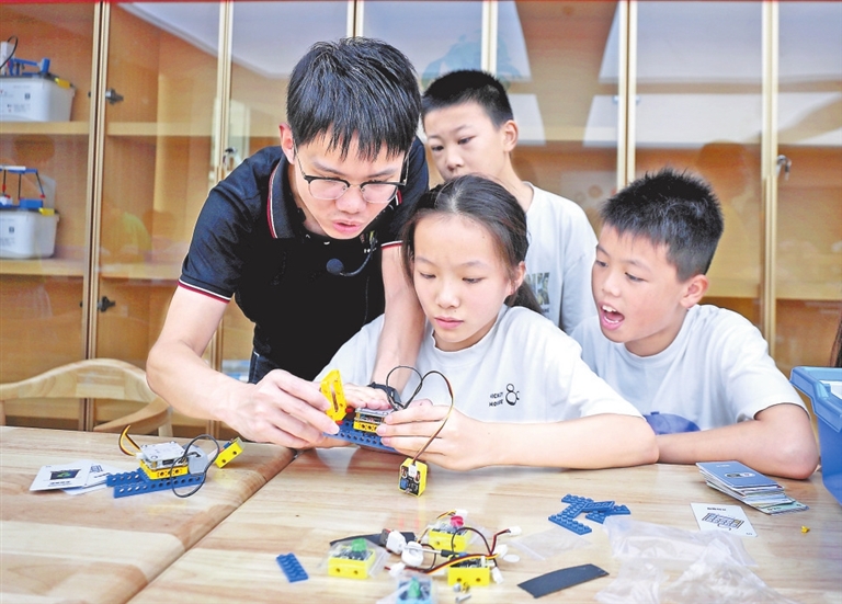 10月2日,老师正在指导小朋友学习机器人编程。中秋国庆假期,分宜县图书馆组织开展益智机器人编程科普宣传活动,邀请专业老师给孩子们上机器人编程公益课,丰富假期生活。特约通讯员 袁建兵摄