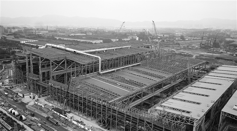 10月2日,在新余市渝水区新钢电弧炉项目建设工地,施工人员正全力推进项目建设。目前,该项目厂房钢结构、建筑结构等基本完工,计划2024年4月投入使用。本报全媒体记者 张翰林摄