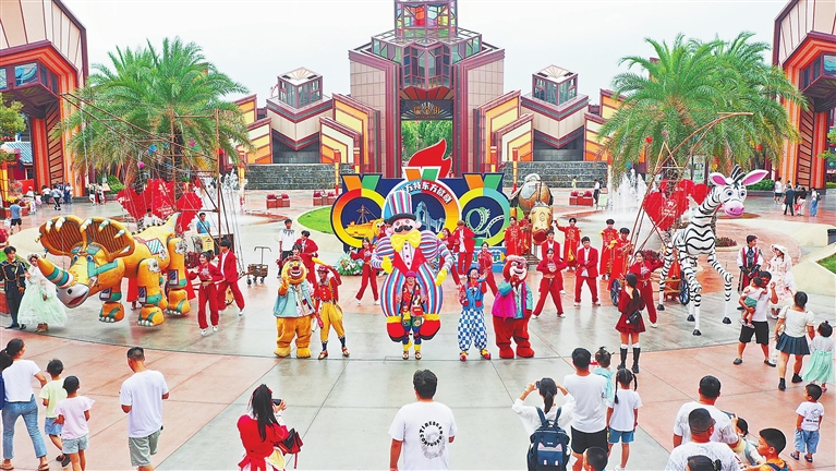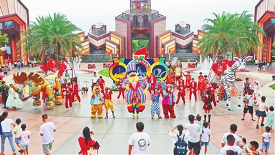 10月4日,游客在赣州方特东方欲晓主题公园观看精彩表演。中秋国庆假期,该主题公园举办方特木偶奇遇节,开展巡游、烟花秀等活动,让游客畅享假日时光。本报全媒体记者 刘美春摄