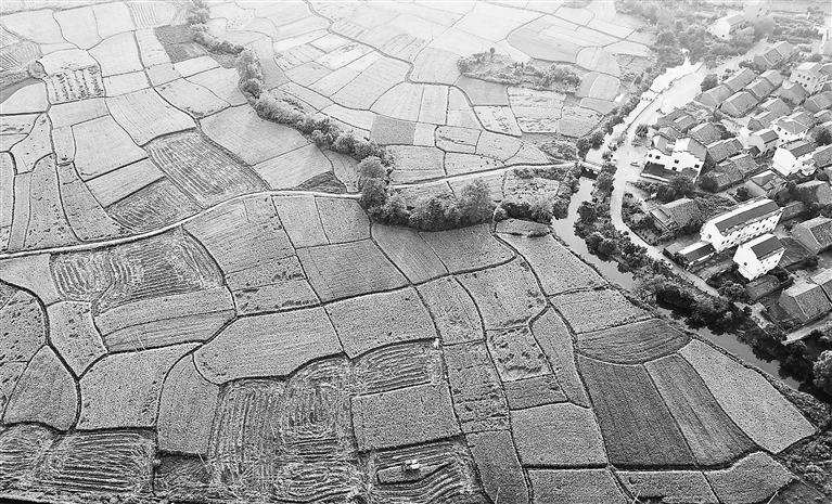 9月29日,从空中俯瞰丰城市梅林镇的乡村田野,农民在稻田里忙着收割,点缀其中的河流、绿树、道路、村庄,共同绘就一幅和美乡村丰收画卷。 本报全媒体记者吴文兵摄
