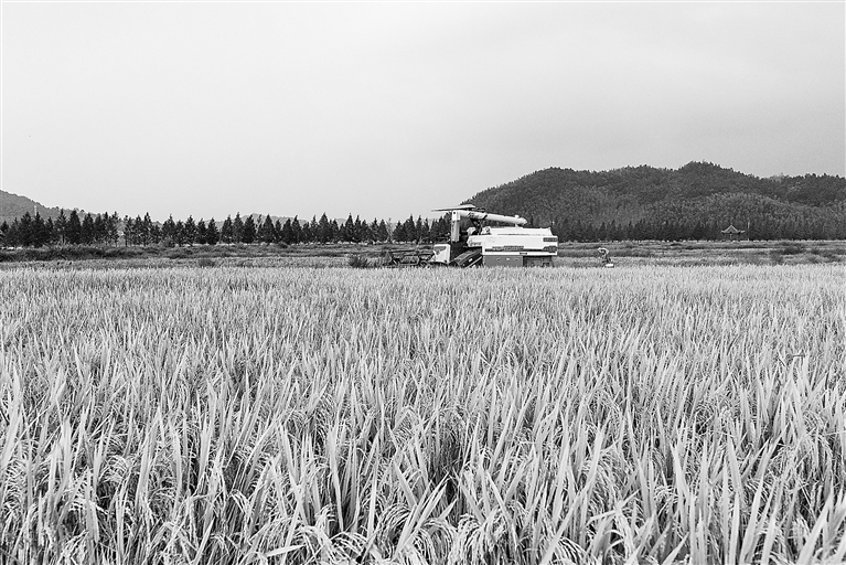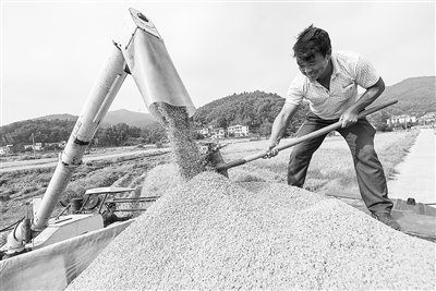 10月1日,金溪县黄通乡墩厚村农民在抢收优质中稻。金秋时节,金溪县17万亩优质中稻进入收获期,农民利用晴好天气,加紧抢收。 特约通讯员 邓兴东摄